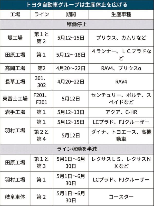 ハイブリッド車「プリウス」などを生産する堤工場(愛知県豊田市)は12~15日に休止する。大型SUV(多目的スポーツ車)「ランドクルーザー」などを生産する田原工場(愛知県田原市)の第1ラインは12~18日を稼働停止にするほか、第1、3ライン共に5~6月は、昼夜二交代制を昼間だけの稼働に切り替える。
