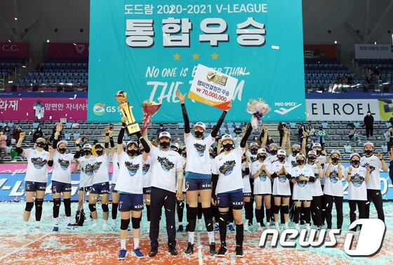 | 30일 오후 인천 계양체육관에서 열린 프로배구 여자부 '2020-2021 도드람 V-리그' 챔피언결정전 시상식에서 GS칼텍스 이소영(왼쪽부터), 차상현 감독, 러츠 등 선수들이 우승 트로피를 들고 기뻐하고 있다. 2021.3.30/뉴스1 © News1 이재명 기자 |